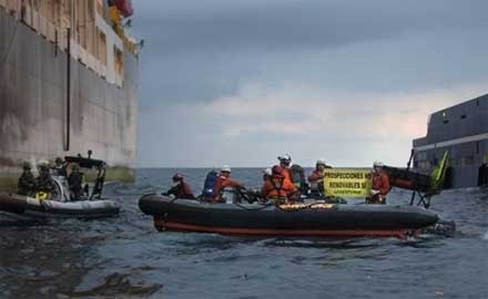 La organización ecologista Greenpeace ha informado desde su página web que esta mañana envió tres lanchas hacia el buque perforador “para realizar una protesta pacífica”, pero dos lanchas procedentes de un patrullero de la Armada las han interceptado. En la acción, dos lanchas de Greenpeace han sufrido “graves daños”, al ser “embestidas” por las embarcaciones de la Armada y una de las activistas ha caído al mar, aunque se encuentra fuera de peligro, de acuerdo con la misma fuente.