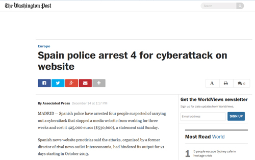 La noticia de la detención de estas cuatro personas supone un paso más en la lucha por la seguridad en internet y su repercusión ha traspasado las fronteras nacionales. Medios de comunicación como ‘The Washington Post’ se han hecho eco del brutal ataque cibernético que prnoticias vivió durante tres semanas en 2013.