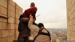 Militantes islámicosse preparan para lanzar a un hombre desde una azotea en Mosul como castigo por ser gay.