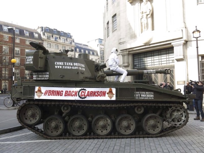 Se planta con un tanque en la puerta de la BBC para pedir que vuelva Jeremy Clarkson a Top Gear