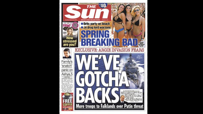 “Nosotros los respaldamos”, es el título de la nota que publica en su portada el diario sensacionalista inglés The Sun en la edición de este martes para anunciar el supuesto envío de tropas del Reino Unido a las Islas Malvinas por “temor a una invasión argentina” con apoyo de Rusia.