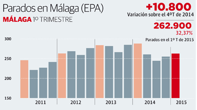 De esta forma, la provincia se sitúa con 262.900 parados (4,3% más que el trimestre anterior) y una tasa de desocupación del 32,37% (2014 se cerró en el 30,86%). Málaga es, con diferencia, la provincia con mayor subida del paro de Andalucía, que sin embargo en su conjunto fue la comunidad autónoma española donde más bajó el desempleo, con 36.600 parados menos. El paro también subió en Sevilla (+6.500), Jaen (+5.600) y Cádiz (+1.400).