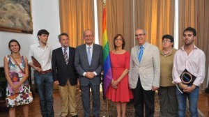 El alcalde de Málaga, Francisco de la Torre (cuarto por la izquierda), posa junto a una bandera del movimiento gay. A su izquierda, la candidata socialista, María Gámez.