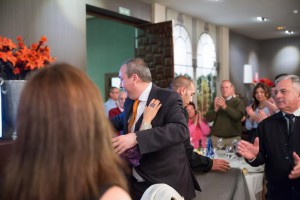 Armando Robles abraza entre aplausos a una de las asistentes a su llegada al acto de presentación de la candidatura de Soluciona