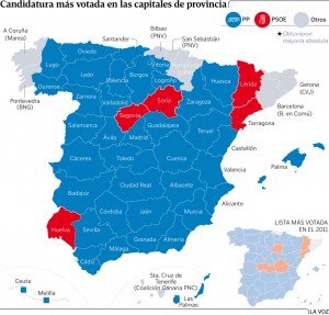 VG.- «Hemos ganado, pero todavía no sabemos quiénes». La célebre frase de Pío Cabanillas Gallas (Pontevedra, 1923) nunca tuvo tanto sentido como hoy, a la luz del panorama político que dibujan los resultados de las elecciones municipales celebradas ayer en toda España. El PP gana en número de votos y concejales, pero sufre un castigo durísimo. Pierde más de diez puntos, dos millones y medio de votos, y se queda sin gran parte de los ayuntamientos que gobierna. Y el PSOE se deja dos puntos y un millón de votos con el peor resultado de su historia, pero recupera poder municipal. A la espera de los pactos, lo único claro es que el mapa político ya no es el mismo, que las mayorías absolutas se acaban, que habrá vuelco municipal a la izquierda y que el bipartidismo toca a su fin. El mayor símbolo de ese cambio es que Madrid y Barcelona pueden estar pronto en manos de partidos surgidos de movimientos sociales.