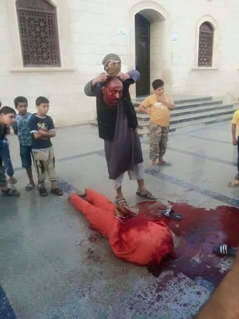 En una segunda foto se ve a un militante sosteniendo la cabeza del hombre mientras que los pequeños niños están rodeando el cuerpo que yace en el suelo todo lleno de sangre. Los terroristas dijeron que la ejecución se llevó a cabo delante de los niños por “fines educativos”.