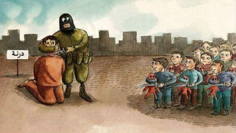 La caricatura -que ha sido ampliamente compartida en las redes sociales en Libia- muestra a un verdugo enmascarado decapitando a un hombre de rodillas mientras se pone delante de un grupo de niños sonrientes. Cada uno de los niños tiene un cuchillo que utiliza para cortarle la cabeza a unos muñecos.