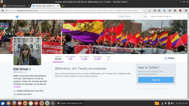 Alba López Mendiola, de la “Villa de Vallekas”, se define a sí misma como “bollera, camionera, desviada, leñadora y feminazi”. Además, considera que está “doctorada en el arte de quejarse” y se ve entiende como “marxista-leninista”.