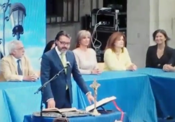 LG.- El regidor de Brunete (Madrid), Borja Gutiérrez, que tuvo que ser investido al aire libre, en plena Plaza Mayor, debido a un incendio en el Salón de Plenos, no dudó en parar su juramento al percatarse de que en aquel improvisado escenario, con el escudo de España y un retrato del Rey Felipe VI presentes, faltaba la imagen de Cristo. (Ver video)
