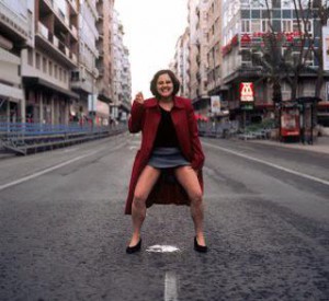 Esa mujer no estaba orinando, venia de “trabajar”, por eso esa postura de piernas separadas, creo que tenia agujetas , tal es su ahinco en el trabajo…. lo de ahinco viene al pelo.