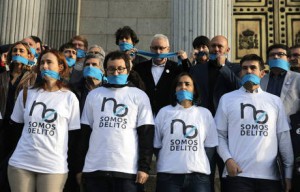La organización difundió a través de Twitter fotografías de sus activistas en la grúa y de otro más, junto a la puerta del congreso, con otra pancarta con el lema “Sin mordazas”, también en protesta por la entrada en vigr este miércoles de la Ley de Seguridad Ciudadana.