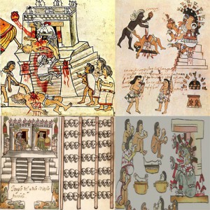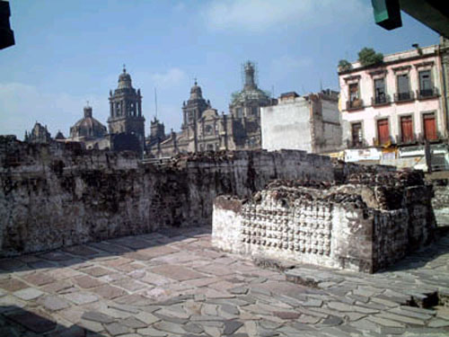 Significativa imagen, metáfora de la liberación de Méjico, la Catedral sustituyendo el Gran Teocalli, Templo Mayor azteca, lugar de asesinatos rituales