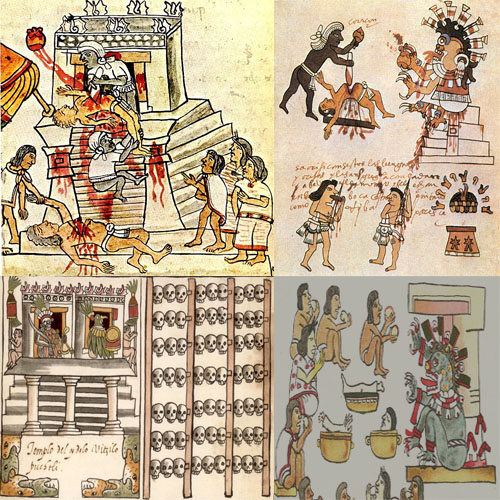 Como cuando los españoles asistiendo a un servicio religioso indígena, escuchando en silencio un sermón de un sacerdote indio, vestido con largas mantas de algodón y que llevaba el cabello, al modo ritual, sin lavar ni peinar desde que había sido ordenado, masa sólida cimentada con la sangre de sus víctimas humanas. Cortés, por media de Melchoi, el intérprete indio, explicó a los indígenas que «si habían de ser nuestros hermanos, que quitasen de aquella casa aquellos sus ídolos que eran muy malos y les hacían error, y que no eran dioses, sino cosas malas, y que les llevarían al infierno sus ánimas v se les dio a entender otras cosas santas y buenas y que pusiesen una imagen de Nuestra Señora que les dio y una cruz y que siempre serían ayudados y tendrían buenas sementeras y se salvarían sus ánimas».