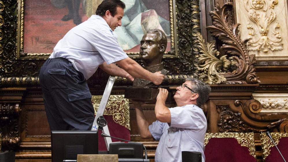 Mientras el primer teniente de alcalde se esforzaba por argumentar la controvertida decisión de Colau, los operarios de mantenimiento aguardaban su turno en el salón de plenos. Provistos de una escalera, esperaron la llegada de la comitiva gubernamental y mediática y retiraron el busto de Don Juan Carlos, lentamente, para deleite de los fotógrafos. Siguiendo órdenes, repitieron la operación para garantizar que la escena quedaba convenientemente registrada y después depositaron la estatua del Rey en una caja de cartón. Su destino será, previsiblemente, el Museo de Historia de Barcelona.