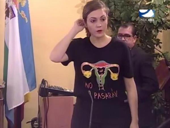 La camiseta de esta individua con pintas de niña pijita que va de rebelde nos habla bien de su enfermedad mental: un aparato reproductor femenino con un “No pasarán” solapado.