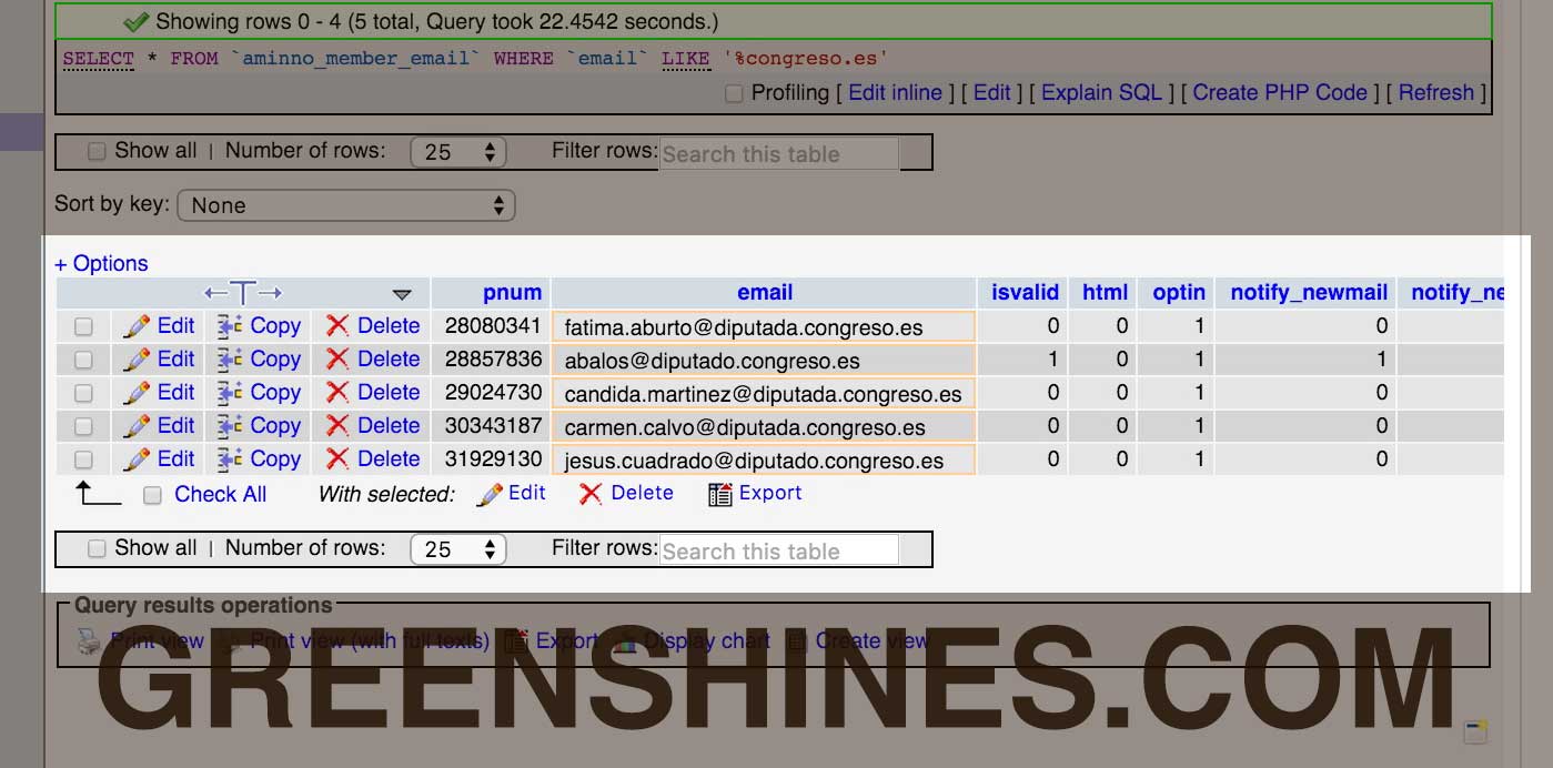 La sorpresa me la llevé cuando me dio por mirar el dominio congreso.es y aparecieron 5 emails. 3 diputadas y 2 diputados que, teoricamente y si hacemso caso a lo que pone la base de datos, se registraron en Ashley Madison usando sus cuentas de email del congreso y usando la conexión a Internet del congreso. Uno de ellos confirmó su dirección de email los otros 4 aparentemente no.