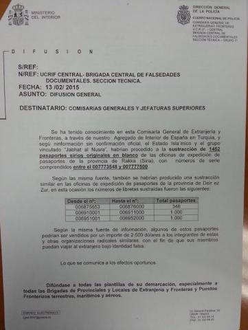 Las mismas fuentes policiales aseguran a este medio que ISIS cuenta con miles de pasaportes sirios más, de los que se desconoce la numeración y que se obtienen en las comisarías de las ciudades que ocupan en el trascurso de la guerra civil que se vive en Siria. Los servicios de inteligencia han detectado que las dependencias policiales son un objetivo prioritario de los islamistas una vez que ocupan una localidad y tienen constancia de que los soportes para realizar pasaportes y cédulas personales son requisados de inmediato sin que consten los números de serie de los mismos.