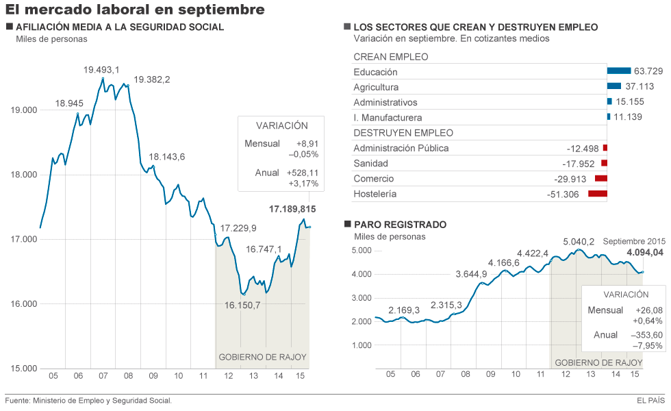 El mercado laboral emitió señales contrarias en septiembre. El paro ha subido; la Seguridad Social, es decir, el empleo, también. El primero creció en 26.087 desempleados, con lo que la cifra de parados inscritos en las oficinas publicas en 4.094.042. La afiliación, por su parte, también ha crecido al contar 8.916 cotizantes, lo que sitúa la cifra total de inscritos en el instituto público en 17.189.815.