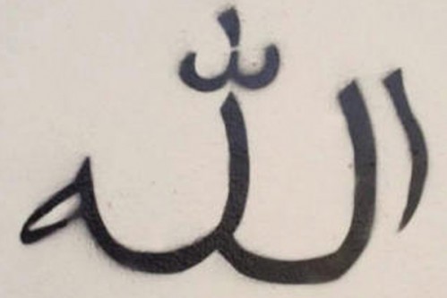 El selló con el que se ha manchado con pintura negra de spray ese carácter cúfico, significa efectivamente “Alláh” en árabe, que es el nombre que los musulmanes dan a lo que en Occidente llamamos “Dios” (Del latín “Deus-Dei”, y este del Griego “Zeus-Dios”).