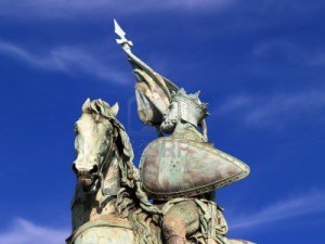 Detalle de la estatua del héroe Godofredo de Bouillon en la Plaza Real de Bruselas. Godofredo de Bouillon fue un caballero medieval que llevó a la primera cruzada contra el Islam y se convirtió en rey de Jerusalén.