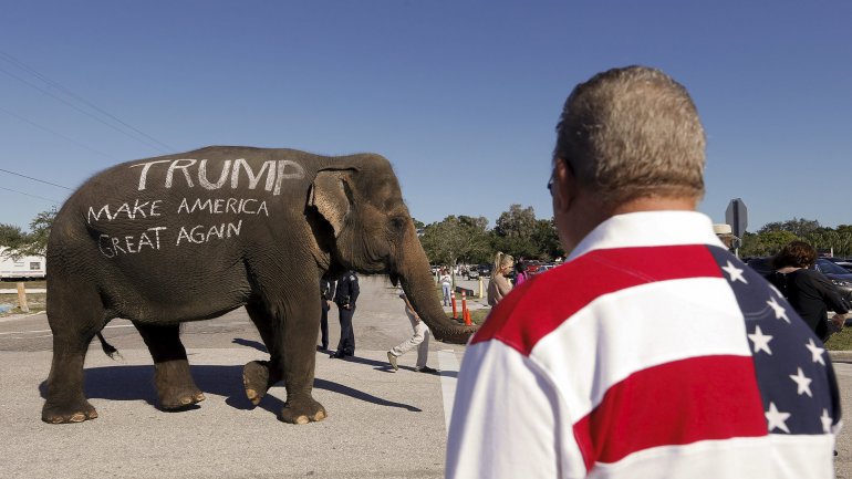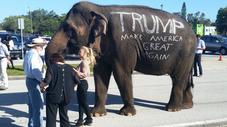 A través de redes sociales se difundieron imágenes que muestra cómo los seguidores del aspirante a la Casa Blanca hicieron desfilar al elefante, símbolo del Partido Republicano, mientras le tomaban fotos.