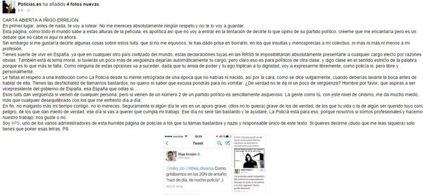 Tienes suerte de vivir en España, ya que en cualquier otro país civilizado del mundo, estas declaraciones tuyas en las RRSS te imposibilitarian absolutamente presentarte a cualquier cargo electo por razones obvias. También está el tema moral, si tuvieras un poco más de vergüenza dejarías automáticamente tu cargo, pero claro eso es para políticos de otra clase, y digo clase en el sentido estricto de la palabra porque es lo que más te falta. Como ninguna de estas opciones va a suceder, dada que tu ansia de poder y tu ego triplican a tu dignidad, voy a expresarme libremente, como policía si, pero libre y personalmente.