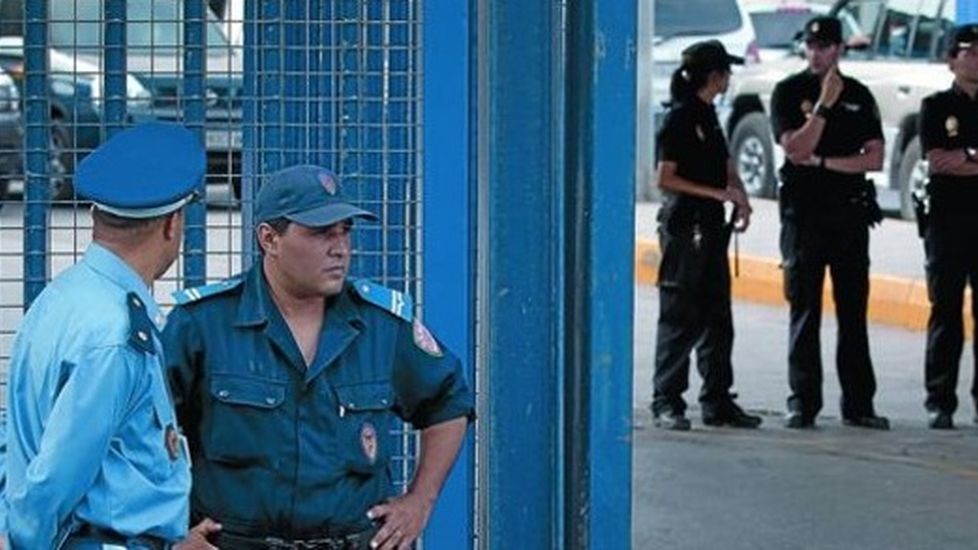Dos agentes de las fuerzas de seguridad marroquí, en la frontera de Beni Enzar. Al fondo, policías españoles.