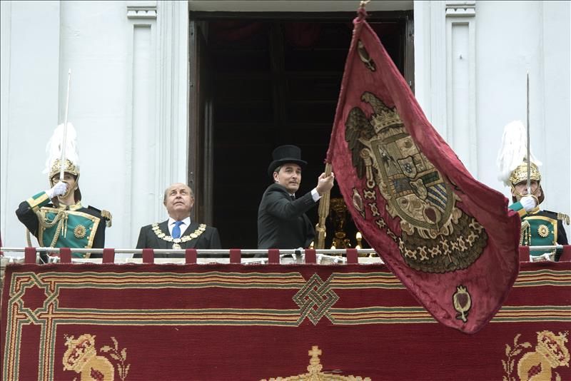 La comitiva ha hecho una ofrenda floral en la Capilla Real donde yacen los Reyes Católicos antes de tremolar por primera vez el pendón, una réplica del confeccionado por Felipe IV entre 1621 y 1623 sobre el modelo original con el que los reyes Isabel y Fernando entraron en la ciudad.