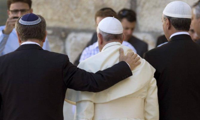 Las dos fotografias, la del brazo por el hombro y la del besamano, representan la tentación de Cristo en el desierto. El judío, con el pecho lleno de medallas por haber matado a palestinos, es el demonio diciéndole a Jesús (el Papa): “Te daré todos los reinos del mundo si, postrándote, me adoras”. Pienso que ha caído en la tentación. Y si no, lo veo como una humillación.