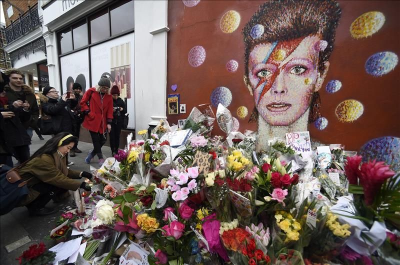 Fans del desaparecido cantante británico David Bowie, depositan hoy flores y dibujos en un altar improvisado en su lugar de nacimiento en Brixton, Londres (Reino Unido).