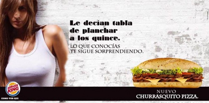 No es un caso aislado. La agencia Vera&Partners diseñó en el 2008 esta campaña para el lanzamiento del Churrasquito Pizza en Argentina. La mujer como objeto para vender un bocadillo. ¿Es necesario?