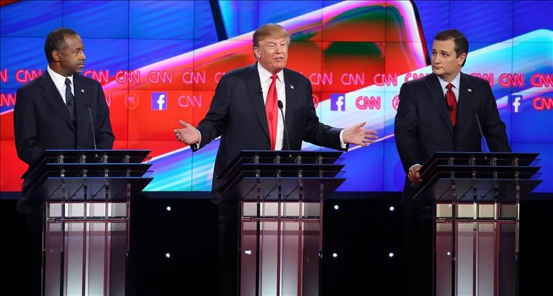 Los candidatos republicanos a la Presidencia de los Estados Unidos (i-d) Ben Carson, Donald Trump, Ted Cruz, en el segundo debate televisado en The Venetian Las Vegas en Las Vegas, Nevada (EE.UU.), celebrado el 15 de diciembre de 2015.