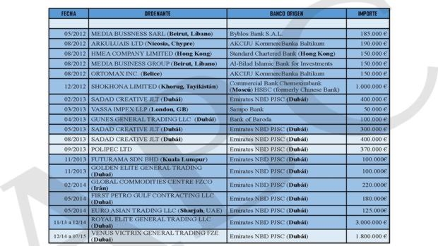 Las tablas reproducidas junto a estas líneas recogen la ruta de esos fondos calificados como «opacos» por la Policía: el dinero sale de Teherán hacia empresas instrumentales que tienen su sede en Beirut (Líbano), Kuala Lumpur (Malasia), Khorug (Tayikistán), Belice, Londres o Nicosia (Chipre), aunque las transferencias las reciben en cuentas abiertas generalmente en Hong Kong, Moscú, Londres y, principalmente, Dubái.