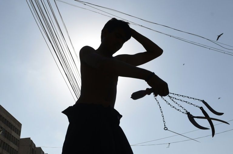 Un paquistaní devoto musulmán chiita participa en un ritual de autoflagelación durante la procesión de Ashura, que conmemora el martirio del imán Husein, el nieto del profeta Mahoma, en Karachi, el 24 de octubre de 2015