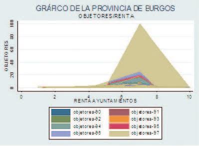 Como se puede ver en las gráficas precedentes existe la característica de aumentar el número de objetores en tanto aumenta la renta que se ve más claramente en el gráfico de la Provincias de Burgos, la que menos índice de objetores ha tenido de toda la Región, y el resto de las que constituían esta Administración Militar Territorial que, para no alargar el artículo, se pueden ver en mi tesis doctoral informatizada en www.defensa-nacional.com.
