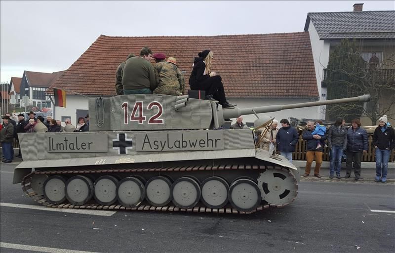 Fotografía faciliada hoy, 8 de febrero de 2016 de una carroza que simula un tanque con una inscripción que reza “Fuerza de Defensa de Asilo Ilmentaler” durante un desfile de carnaval en Reichtshausen, en el distrito bávaro de Pfaffenhofen (Alemania) ayer.