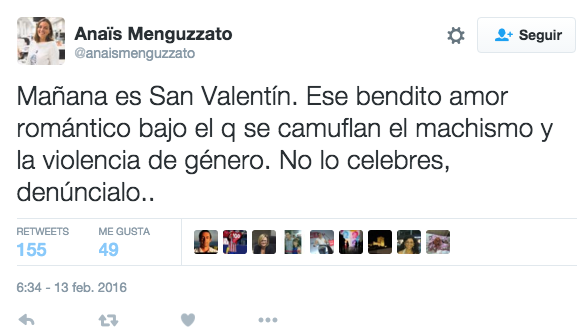 La directora General del Instituto Valenciano de las Mujeres y por la Igualdad de Género, Anaïs Menguzzato, ha denunciado a través de Twitter la celebración del día de San Valentín al considerar que detrás del amor romántico se esconden el machismo y la violencia contra la mujer.