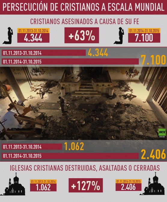 El año 2015 fue el más violento de la historia moderna para la comunidad cristiana al alcanzarse “un nivel similar a la limpieza étnica”, reporta el informe anual elaborado por la ONG Puertas Abiertas. Según la Lista Mundial de la Persecución de 2016, 7.100 cristianos fueron asesinados por practicar su fe en un año –del 1 de noviembre de 2014 al 31 de octubre de 2015–, una cifra superior en 3.000 personas al período anterior, lo que supone un incremento de más del 60% en el número de muertos.