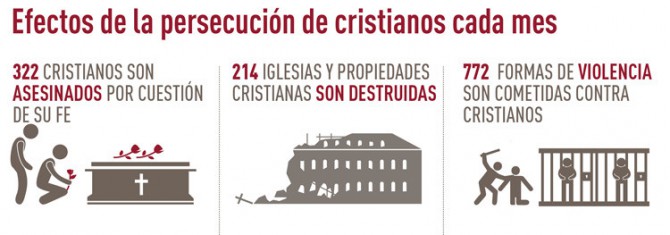 Las estadísticas reportan que actualmente, cada mes, una media de 322 cristianos son asesinados por su fe, 214 iglesias y propiedades cristianas son destruidas y los cristianos sufren 772 formas de violencia, comprendiendo estas últimas torturas físicas, violaciones, matrimonios forzados, arrestos, secuestros, discriminación en la educación y el empleo o incluso la muerte. El estudio destaca al extremismo islamista, al nacionalismo religioso y a los conflictos tribales como principales razones de esta brutal persecución.