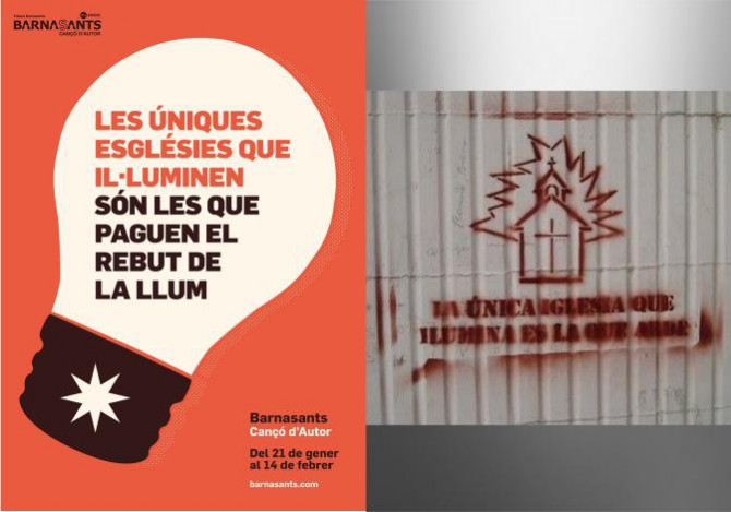 Siento informareles que el cartel no dice “La única Iglesia que ilumina es la que arde”, dice “Las únicas Iglesias que iluminan son las que pagan el recibo de la luz”. ¿Acaso no es verdad?