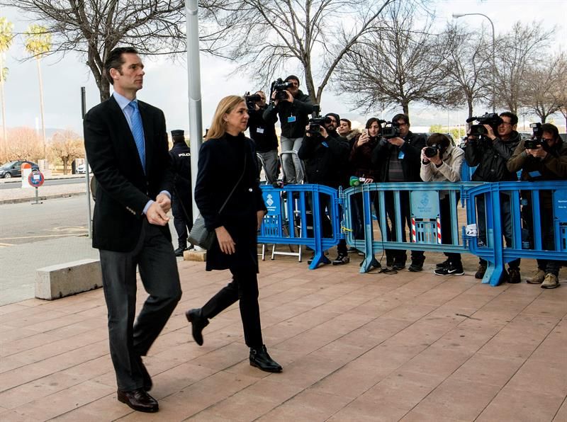 La infanta Cristina y su esposo, Iñaki Urdangarin, a su llegada esta mañana a la Escuela Balear de la Administración Pública (EBAP), donde se celebra el juicio por el caso Nóos que el excontable Marco Antonio Tejeiro volverá a protagonizar hoy, en la que será su tercera jornada de declaración sobre las irregularidades en torno a la asociación sin ánimo de lucro que dirigían Urdangarin y Torres
