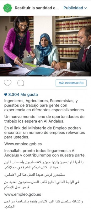 Una misteriosa campaña en las redes sociales lleva meses instando a los musulmanes residentes fuera de España a instalarse en nuestro país mediante engañosas ofertas de empleo y atractivas oportunidades económicas, religiosas, educativas y culturales. Ofrece todo tipo de información en castellano y en árabe sobre puestos de trabajo, permisos y visados y proporciona enlaces con las webs oficiales de los ministerios de Empleo y Asuntos Exteriores, cuenta el diario El Mundo.