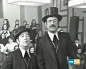 1. Tip y Coll.- Luis Sánchez Polack y José Luis Coll formaron, a mediados de los años sesenta, un dúo cómico llamado Tipicol Spain, que acabó siendo el Tip y Coll que conocemos. Debutaron en televisión en 1969 en Galas del sábado, presentado por Laura Valenzuela y Joaquín Prat. Después vino El último café (1970-1971), Pura coincidencia (1973), Todo es posible en domingo (1974), Lo de Tip y Coll (1974), La Hora de… (1975-1976) o 625 líneas (1976-1979). Sus tics y frases hechas forman ya parte de la historia sentimental de España: “Dáme la manita Pepe Luí” o “¿Para qué?…Paraguayo”. En tiempos de censura se convirtió en popular la frase “La semana que viene…hablaremos del Gobierno”, con la que pretendían burlarse de los últimos coletazos del franquismo. Su última aparición con el nombre de Tip y Coll fue en Nochevieja de Telecinco 1995, en un especial llamado Vamos a por uvas. Vestían traje de enterrador con levitas y chistera o bombín. En el siguiente gaga hablan de la televisión: