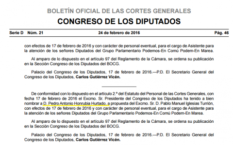 Podemos ha designado ya a sus primeros asistentes en el Congreso, tal y como apareció en el Boletín Oficial de la Cámara el pasado miércoles. Uno de ellos es Pedro Antonio Honrubia Hurtado, número cinco por la circunscripción de Granada en las elecciones del pasado 20 de diciembre y colaborador en la web de extrema izquierda “kaosenlared”.