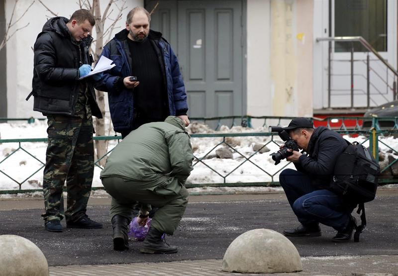 Varios agentes de la policía rusa inspeccionan la zona junto a la estación de metro de “Oktiabrskoye Pole” donde una mujer fue detenida el lunes tras pasearse con una cabeza decapitada en la mano, al parecer de una niña que tenía a su cargo, en Moscú (Rusia).