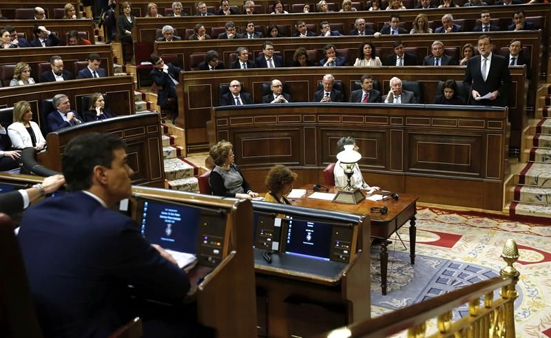 El líder del PSOE Pedro Sánchez (de espaldas-i), escucha desde su escaño la intervención del presidente del Gobierno en funciones, Mariano Rajoy (fondo abajo-d), durante su intervención hoy en el Congreso de los Diputados, en la segunda jornada del debate de investidura.