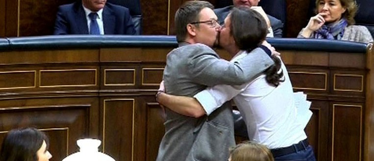 Hay muchos besos históricos, y quizá el Congreso de los Diputados haya visto este miércoles uno de ellos. El portavoz de Podemos, Pablo Iglesias, y el líder de En Comú Podem, Xavier Domènech, se han dado un cariñoso beso en los labios tras el discurso del segundo.