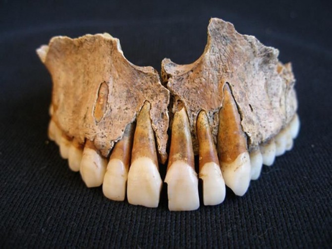 Un fragmento de los incisivos superiores de uno de los esqueletos hallados en el primer cementerio islámico medieval de España, situado en Pamplona, en el que se aprecia la manipulación dentaria intencional de origen probablemente africano y por razones estéticas.
