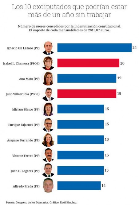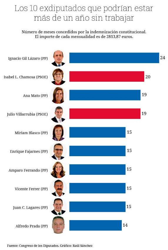 Ana Mato, por poner un ejemplo, ya que la lista es larga y de todos los colores, dice que después de dejar la silla no encuentra trabajo, de ahí que el sistema constitucional de 1978, proclame que tiene derecho a recibir 53.464 euros de indemnización repartidos en 19 meses. Pero, Ignacio Gil Lázaro, que dice que tampoco encuentra empleo, aun cobrará más. Los ex diputados pueden cobrar hasta un mes de sueldo por año trabajado.