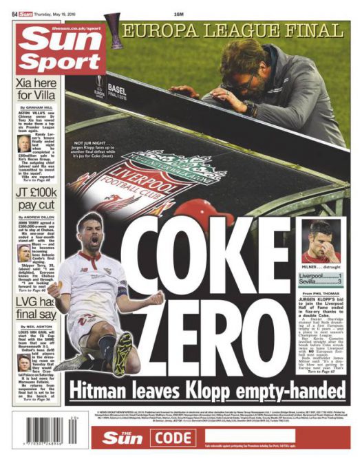 The Sun: “Coke Zero”. “Deja al Liverpool con las manos vacías”. “El Sevilla acabó con la última oportunidad de que el Liverpool jugara la Champions el próximo curso”. “Los andaluces tuvieron suerte de llegar al descanso perdiendo sólo por un gol, pero regresaron siendo un equipo diferente”.